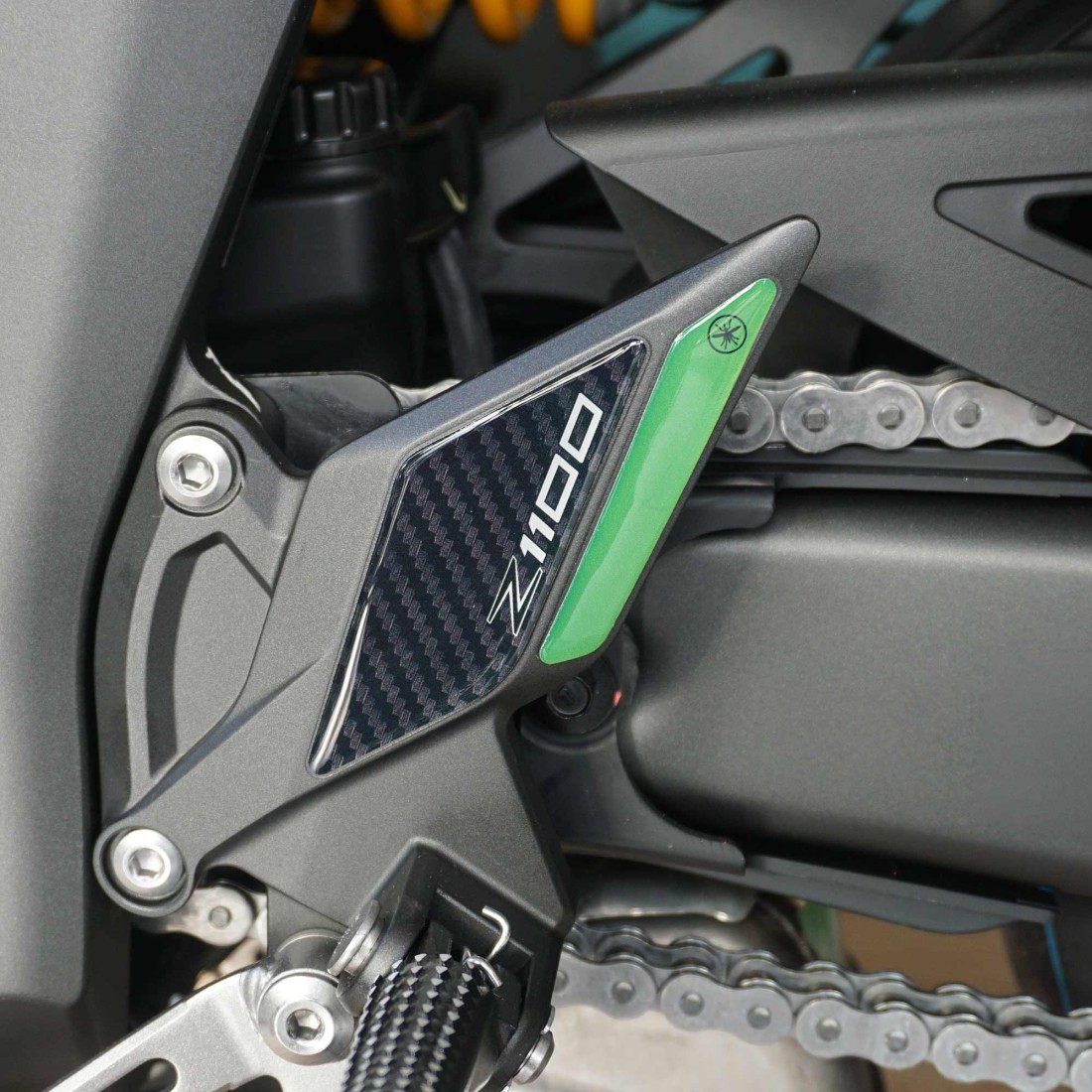 Unsere Aufkleber dekorieren und schützen vor Stößen und Kratzern den Fußrastenbereich Ihres Motorrads, sie sind wasch- und witterungsbeständig und resistent gegen UV-Strahlen. Seitenschutz für Motorrad, Fußrastenbereich aus 3D-Harz kompatibel mit Kawasaki Z1100 2026.