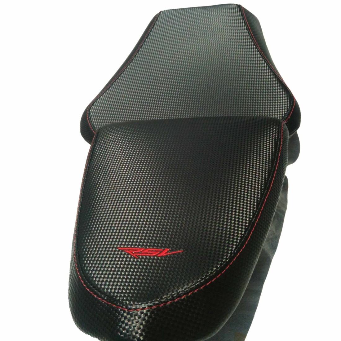 Exklusiver Sitzbezug aus wasserdichtem und rutschfestem Material um einen hervorragenden Halt zu garantieren, ohne den Komfort zu beeinträchtigen! Effekt Simil Carbon (Carbon Look) mit Nähten und RSV-Schriftzug in Rot.