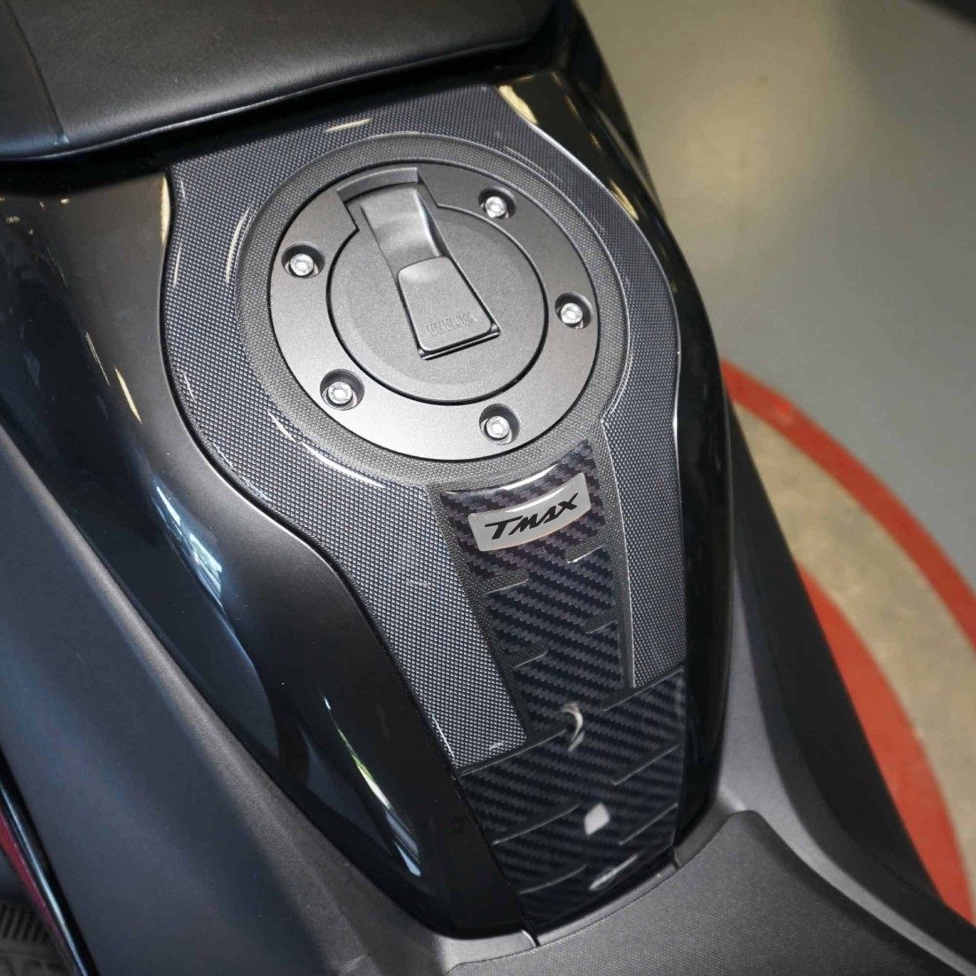 Klebeschutz für den Mitteltunnelbereich Tmax 2022 - 2025 und Tech Max Version. Grafik mit Basis aus Simil Antislip und Carbon-Effekt mit Tmax-Schriftzug in 6 verschiedenen Farben. Aufkleber mit 3D-Effekt aus Harz, Exklusives Labelbike MADE IN ITALY.
