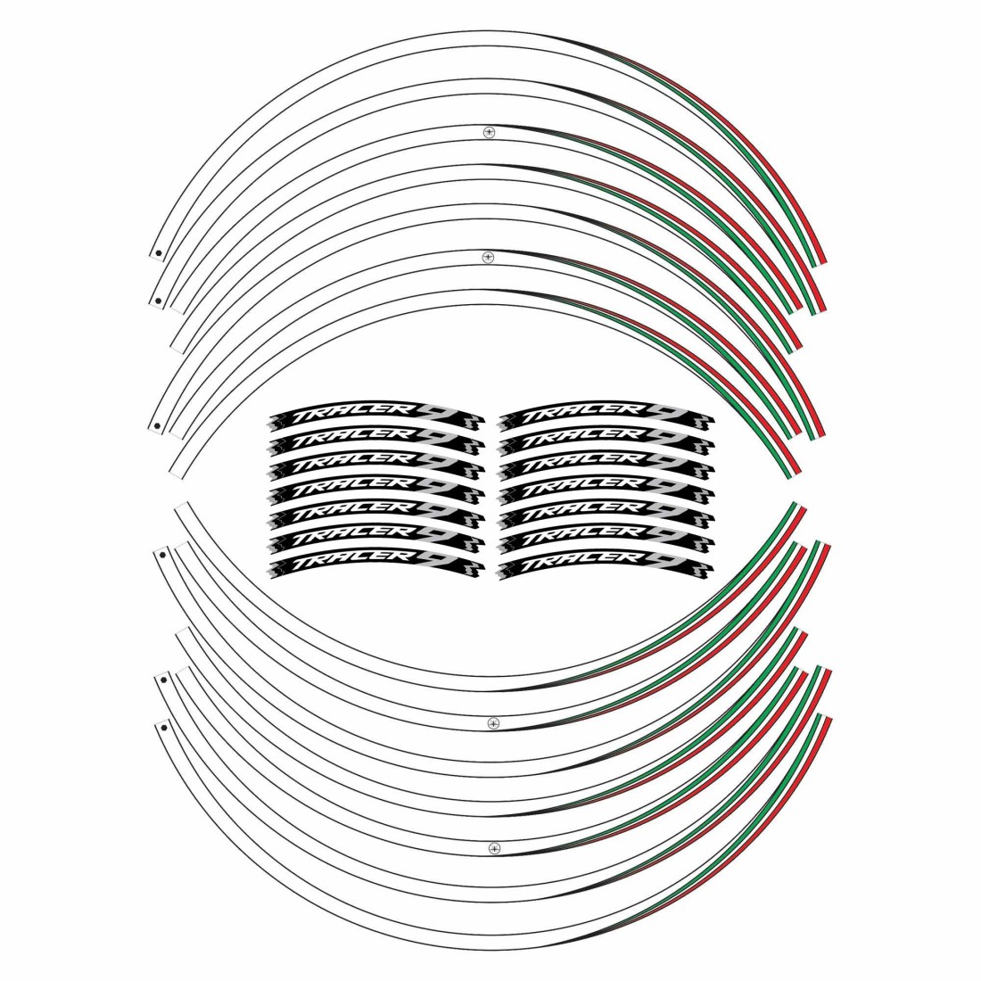 Motorrad-Radaufkleber MADE IN ITALY. Weiße, schwarze oder rote Grundgrafik mit Details und Schriftzug der dreifarbigen italienischen Flagge Leuchtspur 9.