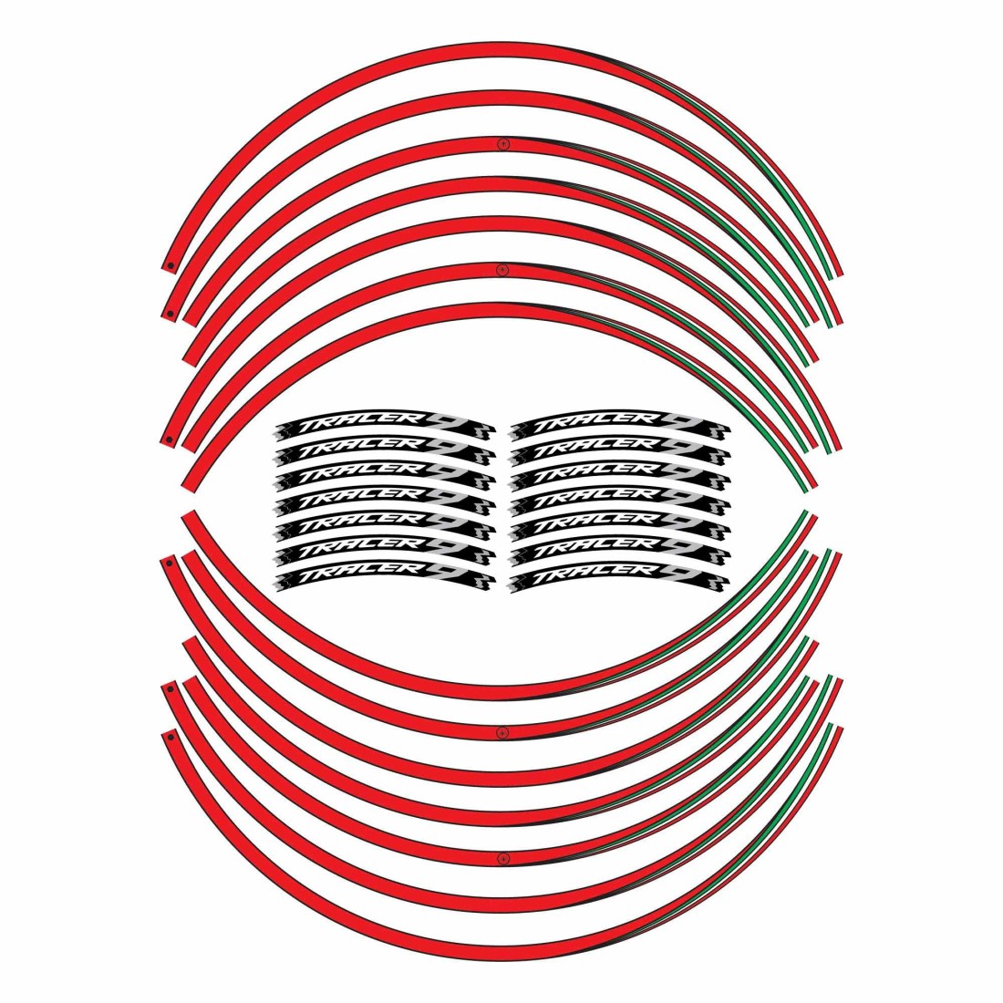 Motorrad-Radaufkleber MADE IN ITALY. Weiße, schwarze oder rote Grundgrafik mit Details und Schriftzug der dreifarbigen italienischen Flagge Leuchtspur 9.