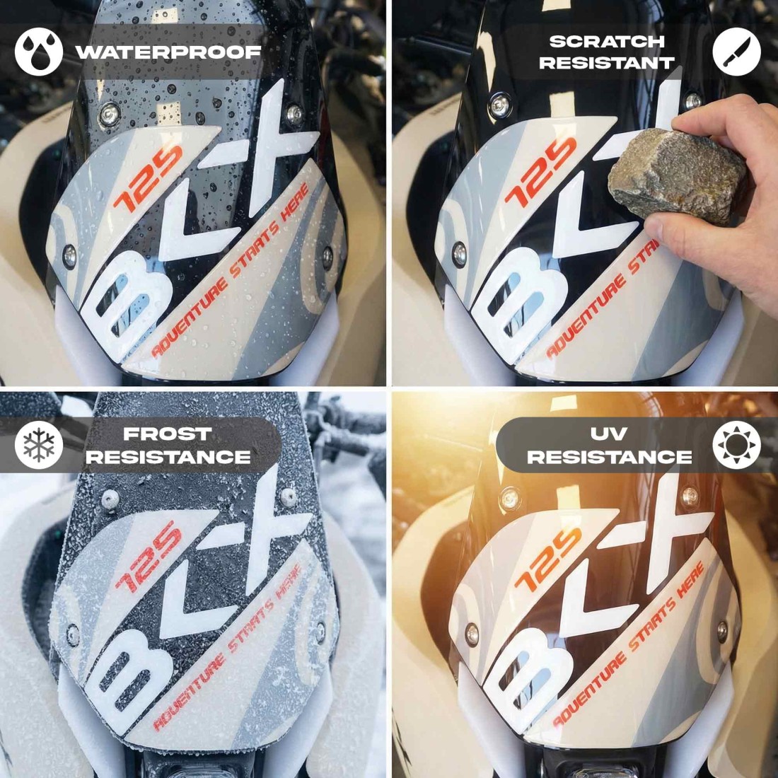 Resina de gel adhesivo protector de parabrisas moto compatible con Benelli BKX 125 a partir de 2026. Pegatina adhesiva protección delantera moto, Exclusivo Labelbike realizado en resina con efecto 3D.