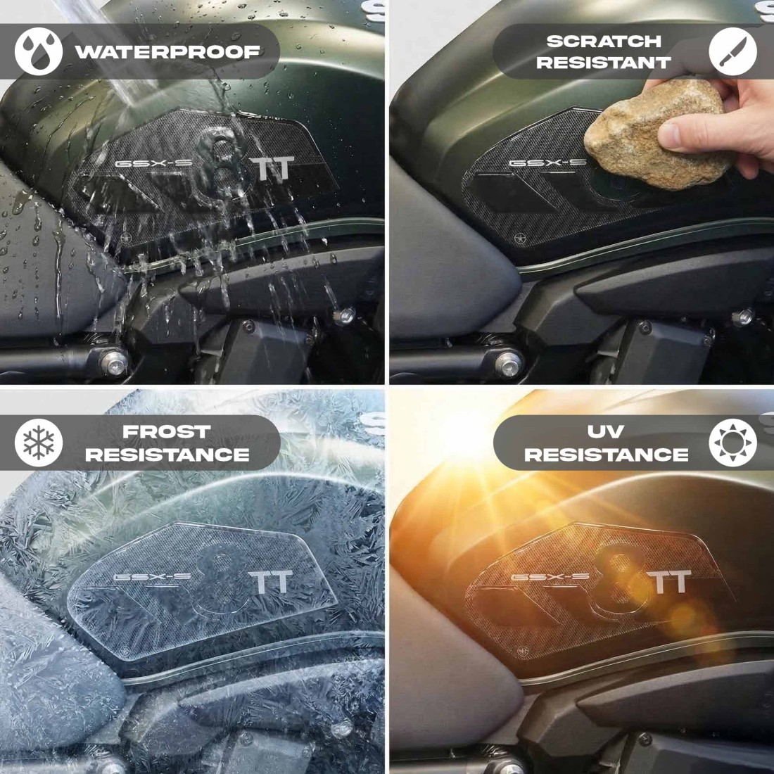 Protectores laterales adhesivos resinados para depósito de moto compatibles con Suzuki GSX-8TT. Pegatinas de resina 3D Gel Exclusivo - Labelbike. Pegatinas protectoras de arañazos para motos HECHO EN ITALIA Realizados en resina con efecto 3D. Gráficos monocolor, aptos para ambos colores de moto.