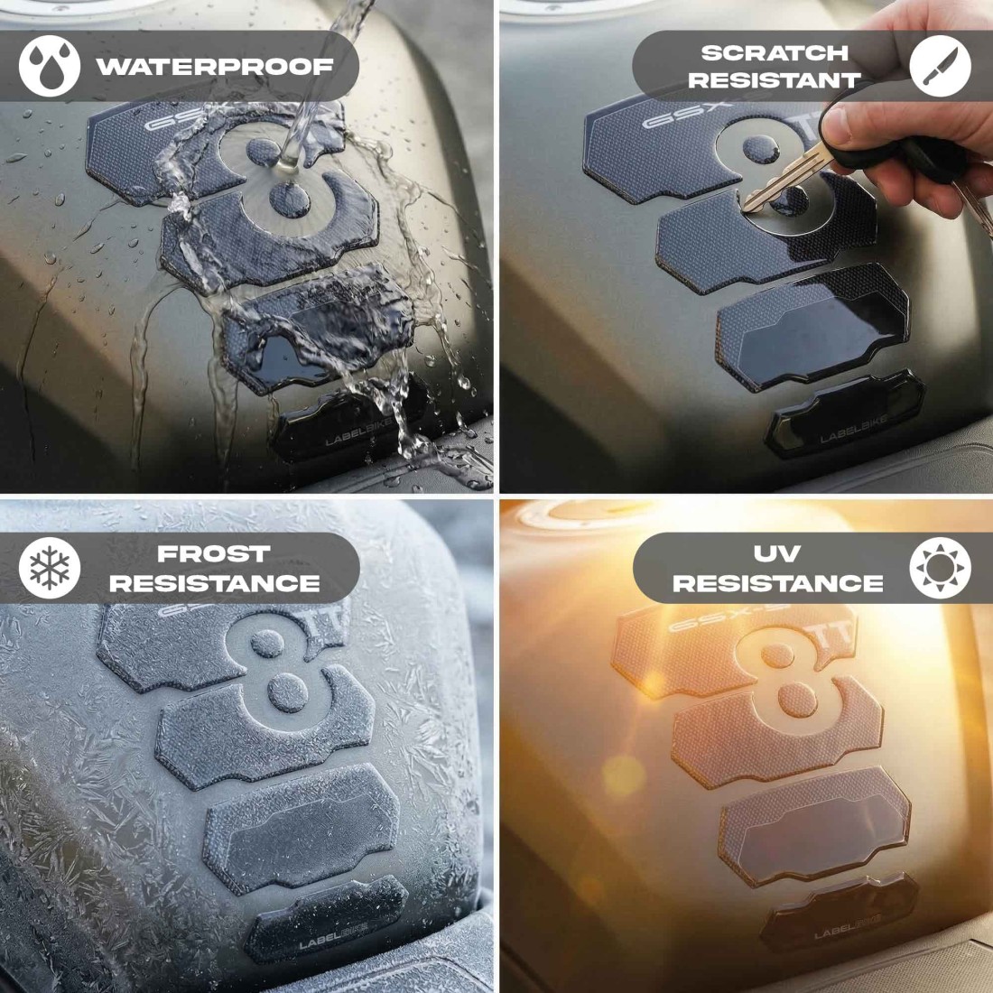 Protector de depósito de moto de resina adhesiva compatible con Suzuki GSX-8TT. Pegatinas 3D de resina de gel Exclusivo - Labelbike. Protector de depósito adhesivo arañazos para motos HECHO EN ITALIA Realizados en resina con efecto 3D. Gráficos monocolor, aptos para ambos colores de moto.