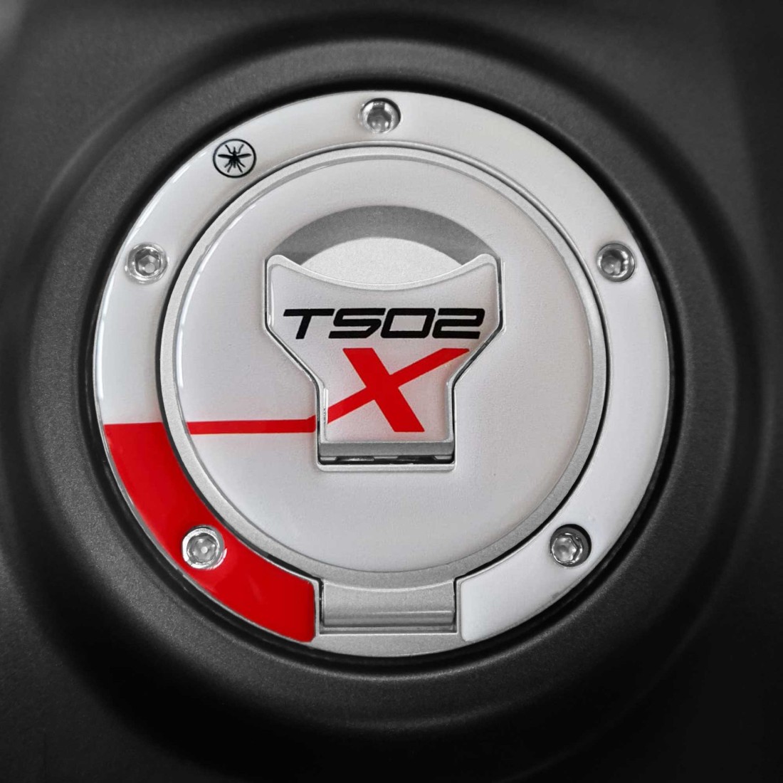 Protección adhesiva para tapón de combustible de moto realizada en resina con efecto 3D. Para nuestros protectores adhesivos hemos creado gráficos recubiertos de resina en tres colores compatibles con los tres colores de la moto.