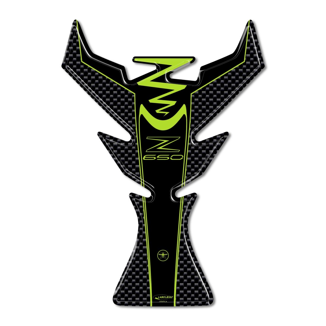 Protección adhesiva de resina para proteger y decorar el depósito de tu moto compatible con Kawasaki Z650 2017 - 2022. Adhesivo de resina en gel 3D. Exclusivo - Labelbike®. Pegatina de protección del depósito de la moto, HECHO EN ITALIA de resina con efecto 3D. Protector de depósito 3D con gráficos efecto carbono (Carbon Look) y detalles en verde lima.