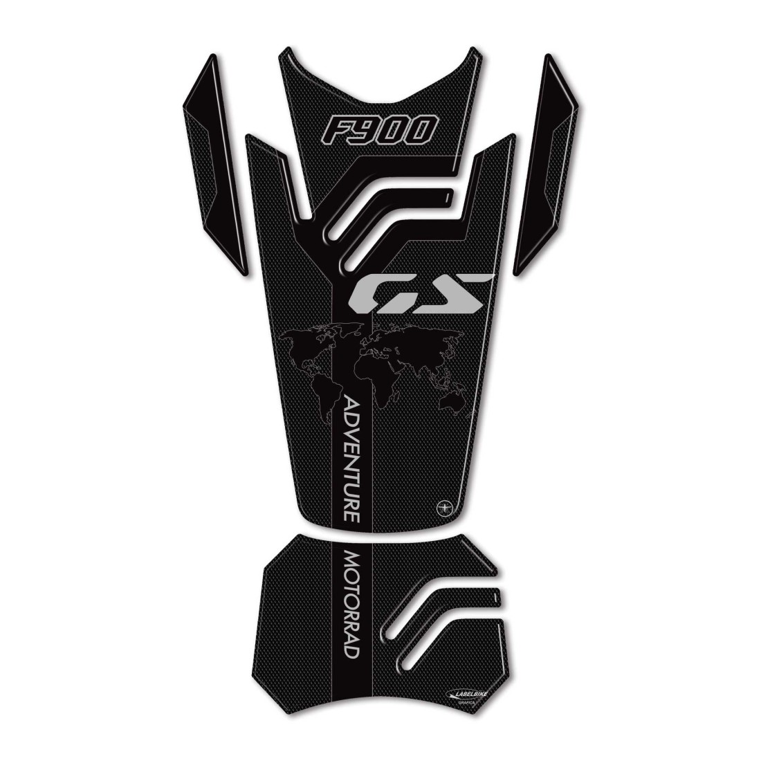 Protector de depósito adhesivo de resina para motos BMW F 900 GS Adventure. Gel adhesivo 3D de resina Exclusivo - Labelbike®. Protector de depósito adhesivo HECHO EN ITALIA Fabricado en resina con efecto 3D. Gráficos producidos en dos colores diferentes para ser compatibles con los colores de la moto Aventura BMW F900 GS a partir de 2024.