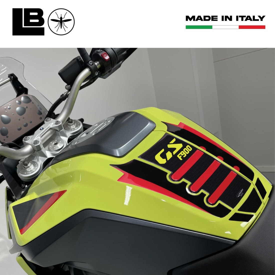 Protector de depósito adhesivo de resina para depósitos de motos BMW F 900 GS. Gel adhesivo 3D de resina Exclusivo - Labelbike®. Protector de depósito adhesivo HECHO EN ITALIA Fabricado en resina con efecto 3D. Gráficos creados en tres colores diferentes para ser compatibles con los 3 colores de moto BMW F900 GS a partir de 2024: Black Storm metalizado, Passion (amarillo), GS Trophy. Adhesivos para motos con placa en doble relieve 3D y letras GS F900.