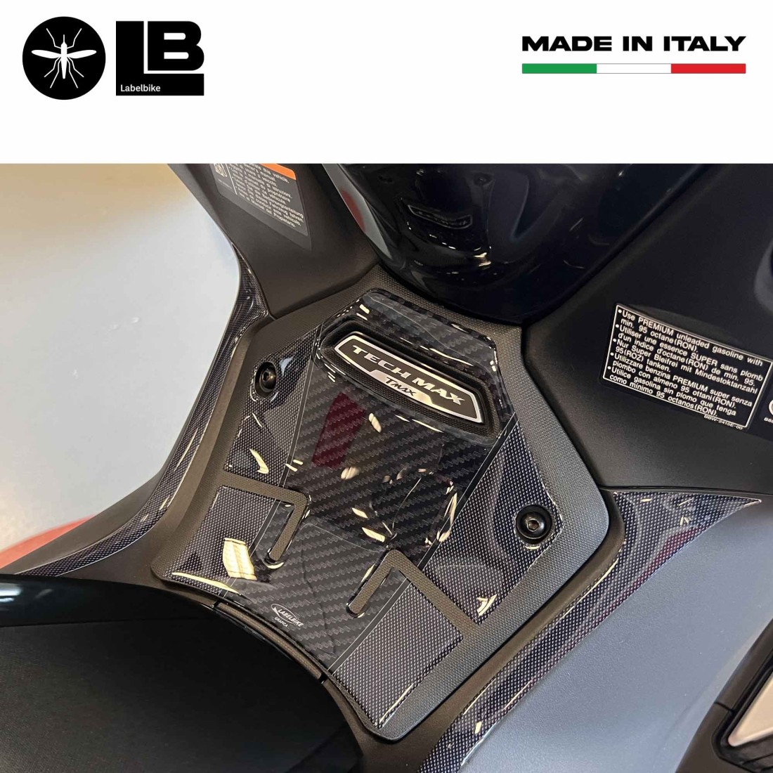 Protectores adhesivos para estriberas túnel central Tmax 560 y versión Tech Max. Gráficos con base de carbono y efecto antideslizante. Pegatinas de resina efecto 3D, Exclusivo Labelbike MADE IN ITALY.
