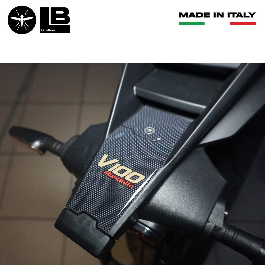 Protección adhesiva de resina para Moto Guzzi V 100 2022 - 2025. Protección adhesiva para la zona del colín del portamatrículas de la moto. Adhesivo de resina en gel 3D Exclusivo - Labelbike HECHO EN ITALIA con gráfica universal y compatible con todos los colores de la V 100 y versión S. Adhesivo 3D de resina con base Carbon Look (efecto carbono) y escritura Mandello V100.