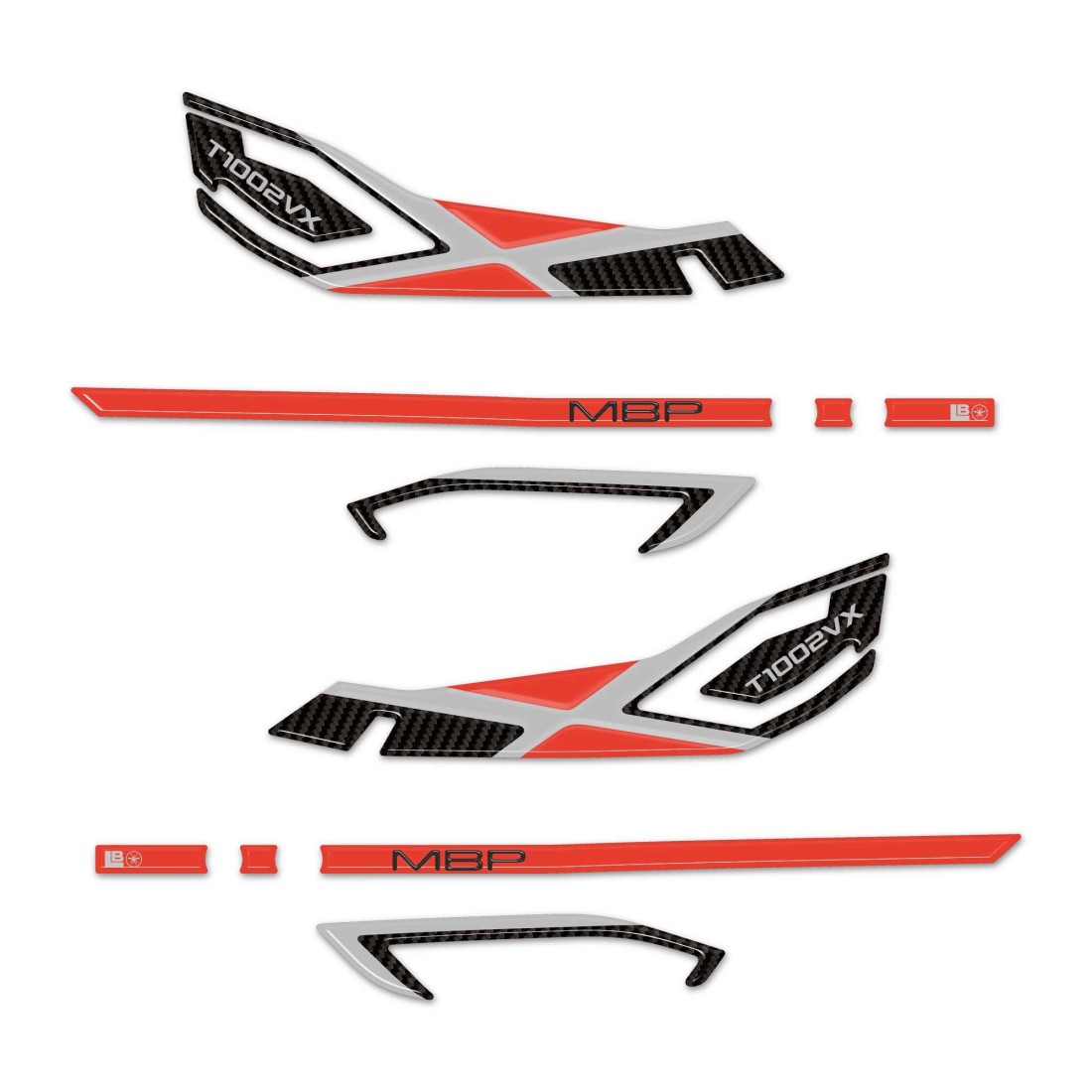 Autocollants pour garde-mains avant de moto en résine avec effet 3D. Pour nos protège-mains adhésifs, nous avons créé un graphisme en résine d'une seule couleur compatible avec les deux couleurs de la moto. Protections adhésives en résine pour garde-mains de moto avec graphisme rouge et lettrage 1002. Paire d'autocollants pour protège-mains de moto droite et gauche compatibles avec Morbidelli T1002VX 2025.
