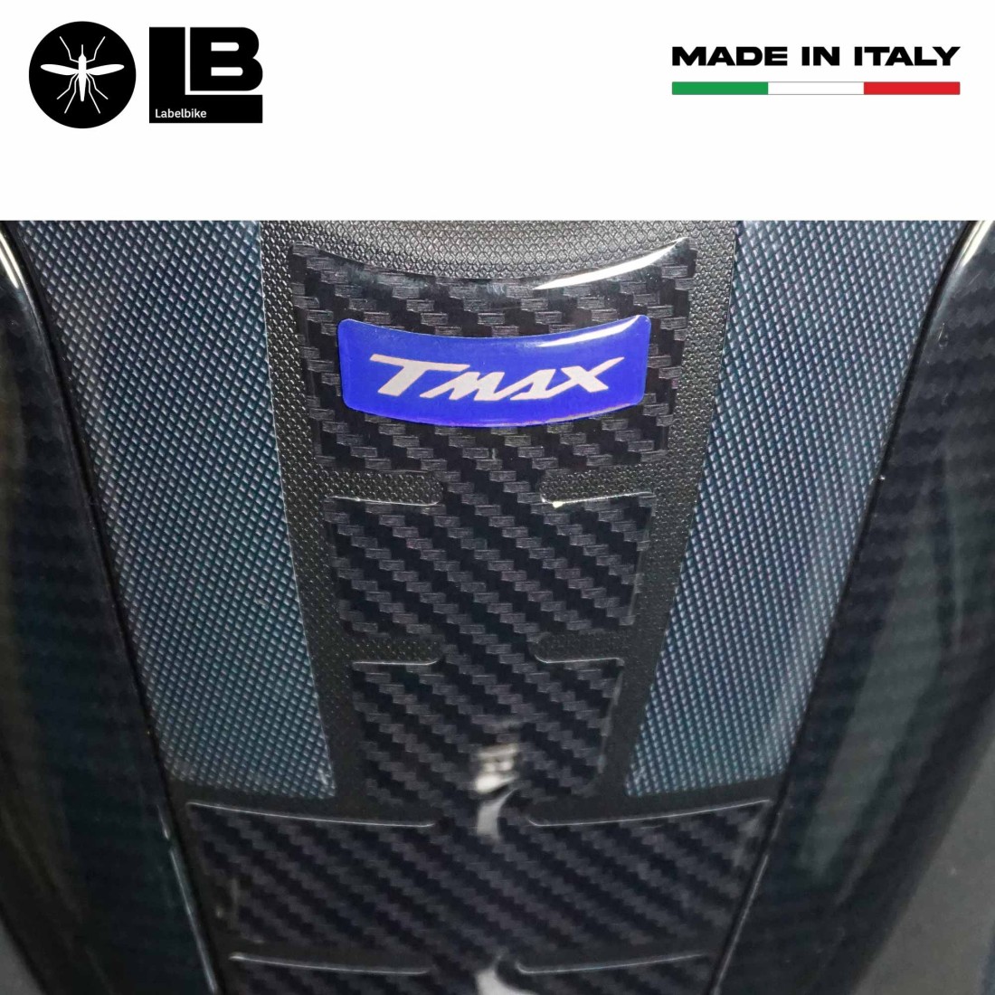 Protection adhésive pour la zone centrale du tunnel Tmax 2022 - 2025 et version Tech Max. Graphiques avec base en Simil Antislip et effet carbone avec écriture Tmax en 6 couleurs différentes. Autocollants en résine à effet 3D, Exclusivité Labelbike MADE IN ITALY.