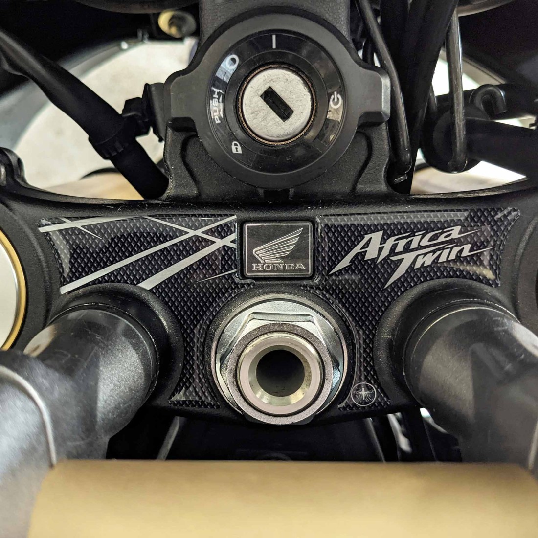 Autocollants en résine gel 3D compatibles avec Honda Africa Twin 1000 à partir de 2016 et Honda Africa Twin 1100, y compris les versions Adventure, pour la protection du té de fourche supérieur, spécialement conçus pour recouvrir la partie supérieure et la préserver de l’usure quotidienne sans modifier les lignes d’origine de la moto.