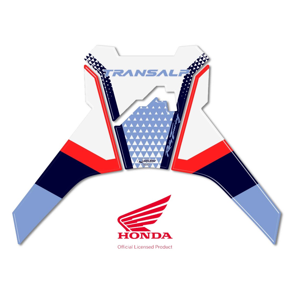 Protège réservoir adhésif moto en résine avec effet 3D. Autocollant de protection en résine avec graphisme en blanc ou gris et lettrage Transalp.