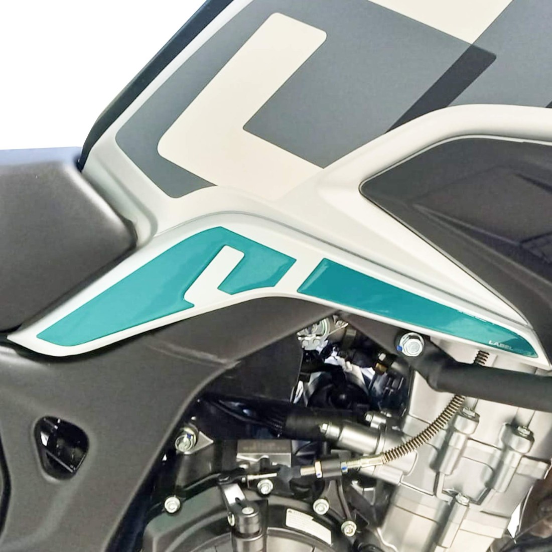 Motorbike tank protector stickers made of resin with 3D effect. Resin motorbike tank side stickers with graphics in Cyan (Tiffany Silver) or Gold (Sand Dark Grey).