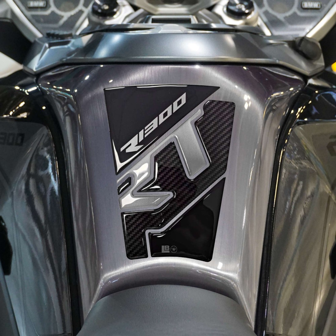 Resin tank protector sticker with 3D effect. Resin adhesive protectors with dedicated graphics in two different colours. Tank protector compatible with Bmw R1300RT from 2025.