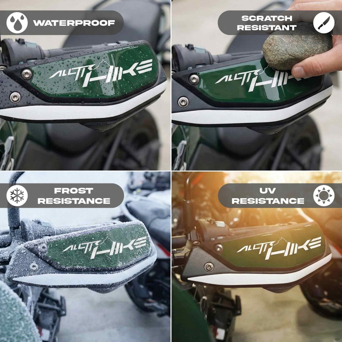 3D adhesive protectors compatible with Moto Morini Alltrhike 450 (2026). Resin stickers left and right side to protect and decorate the front hand guards of your bike. Resin-coated motorbike graphics 3D effectglossy surface, motorbike protection.