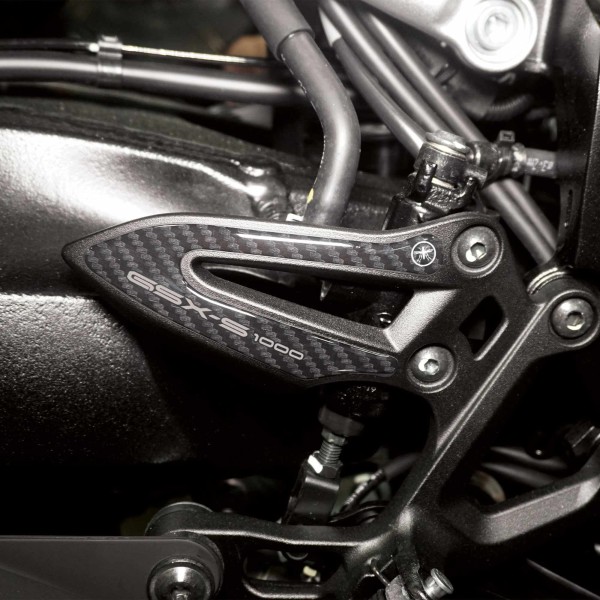 Resin heel protector stickers with 3D effect. Pair for left and right side of adhesive resin protectors with Carbon Look graphics (carbon effect) and GSX-S1000GX lettering.