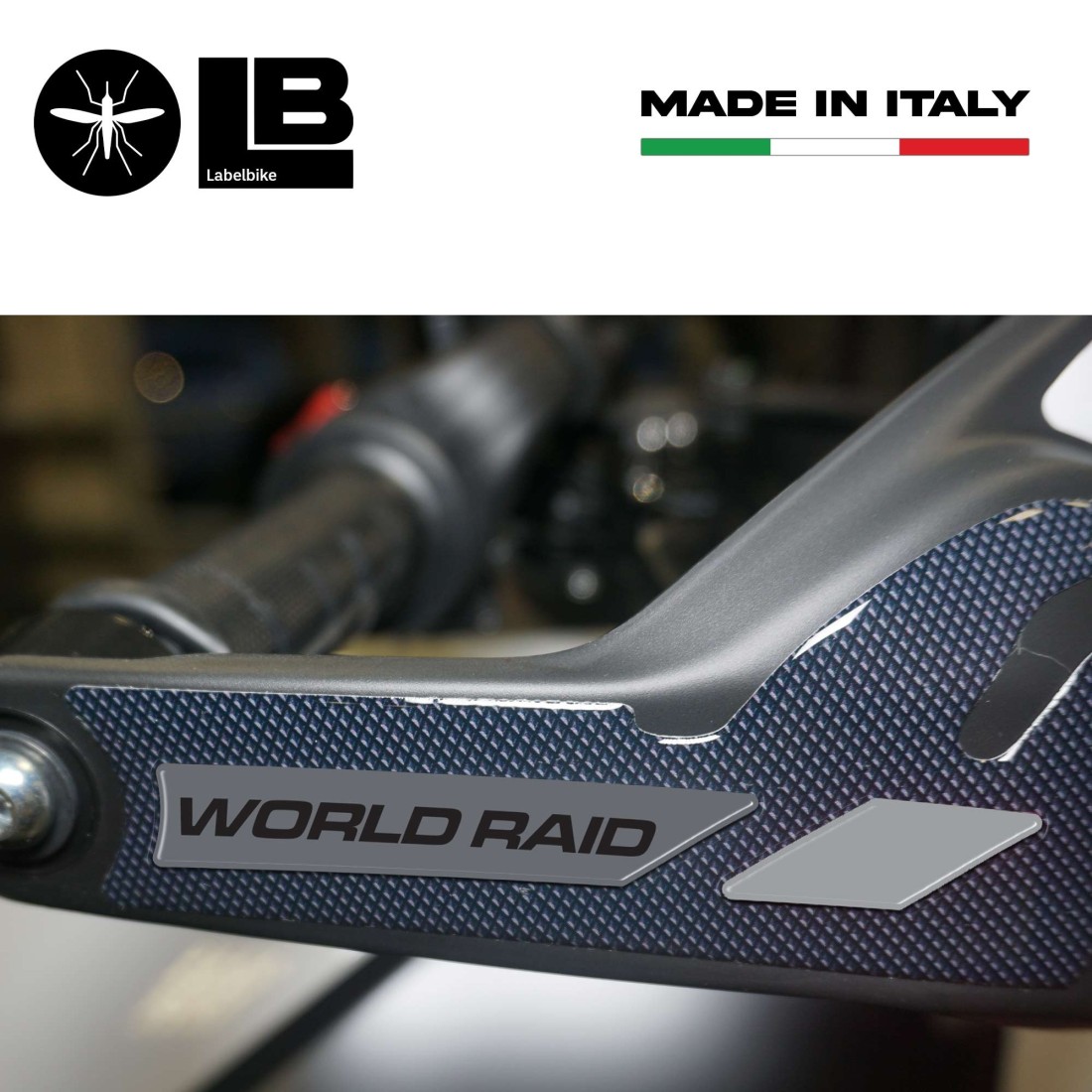 Resin adhesive protectors for Yamaha Tenere 700 motorbike handguards 2022. Two stickers for motorbike handguards right and left side in 3D resin gel Exclusive - Labelbike®. Stickers for Tenere 700 handguards in 2022 colour. Stickers MADE IN ITALY made in resin with 3D effect. Graphics with anti-slip effect base and lettering World Raid.