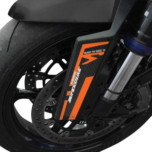 Motorbike stickers made of resin with 3D effect. Resin stickers to protect and decorate the mudguards of your motorbike. Graphics with carbon effect (carbon look) and details in orange or red, dedicated to colours from 2024 onwards KTM 1390 Super Duke R.
