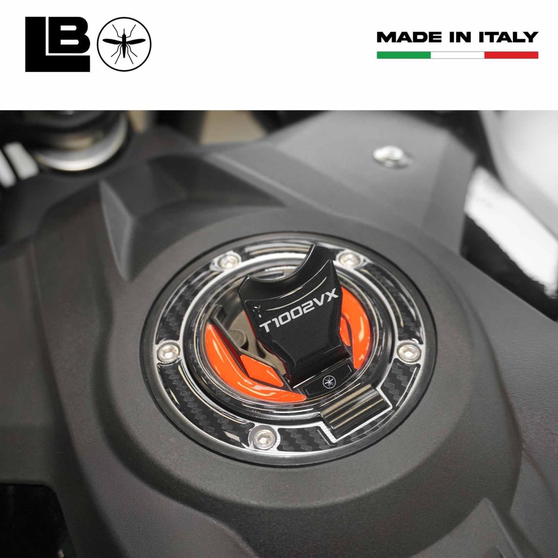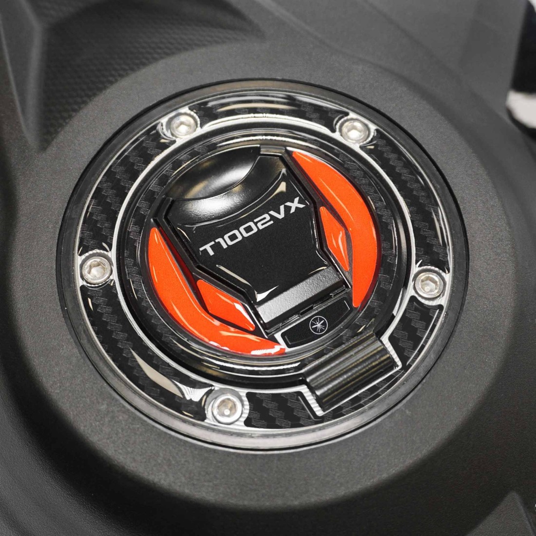Fuel cap cover sticker made of resin with 3D effect. For our adhesive protectors we have created a resin-coated graphic in a single colour that is compatible with both motorbike colours. Resin adhesive protectors for motorbike fuel tank with graphics in black, carbon effect and red. 3D motorbike tank cap sticker compatible with Morbidelli T1002VX 2025.