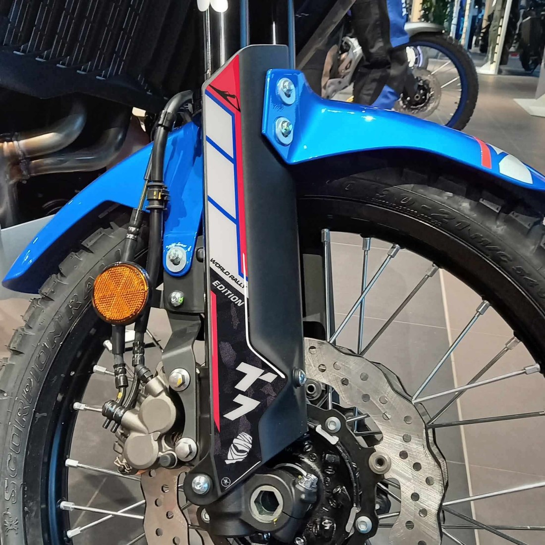 Resin adhesive side protectors for Tenere 700 World Rally motor bike wing 2024. Two 3D gel resin stickers Exclusive - Labelbike. Adhesive side protectors for front mudguard MADE IN ITALY made in resin with 3D effect. Graphics dedicated to the new 2023 edition colours World Rally.