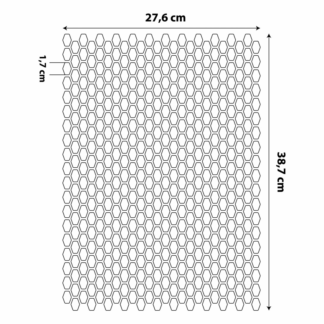 The sheet measures approx. 27.6 x 38.7 cm and is made up of approx. 450 individual hexagons, each approx . 1.7 cm high, so you can cut them out and combine them. you can cut them out and combine them as you wish to create lettering, arrows, patterns or real bumpers. The transparent resin layer creates a three-dimensional effect that is pleasant to the touch and absorbs bumps, sport marks, bag rubs and minor impacts.