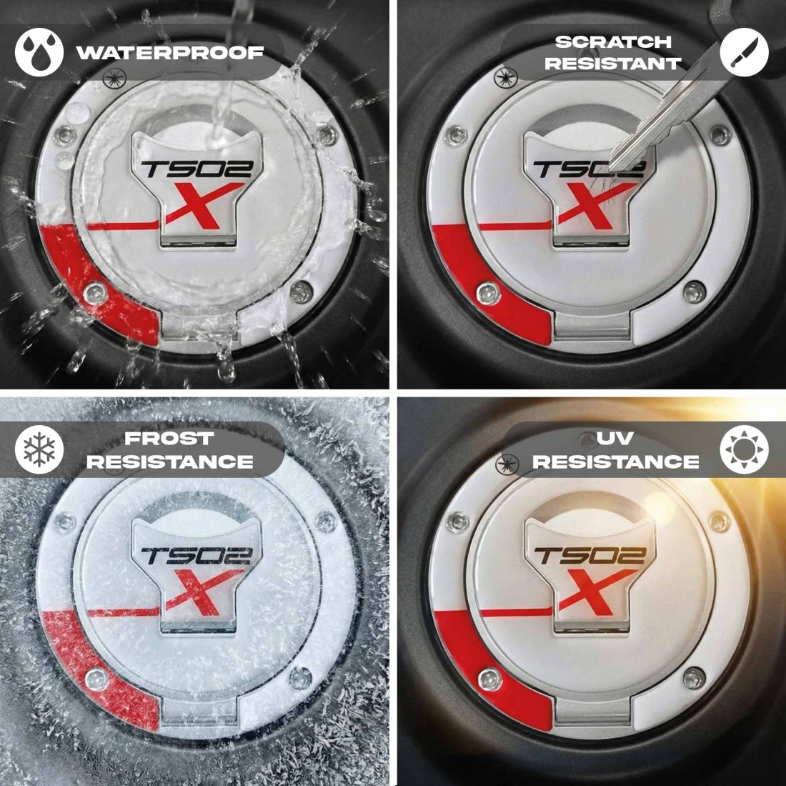 Adesivo protezione per Tappo serbatoio moto realizzato in resina con effetto 3D. Per le nostre protezioni adesive abbiamo realizzato una grafica resinata in tre colorazioni compatibili con le tre colorazioni della moto.