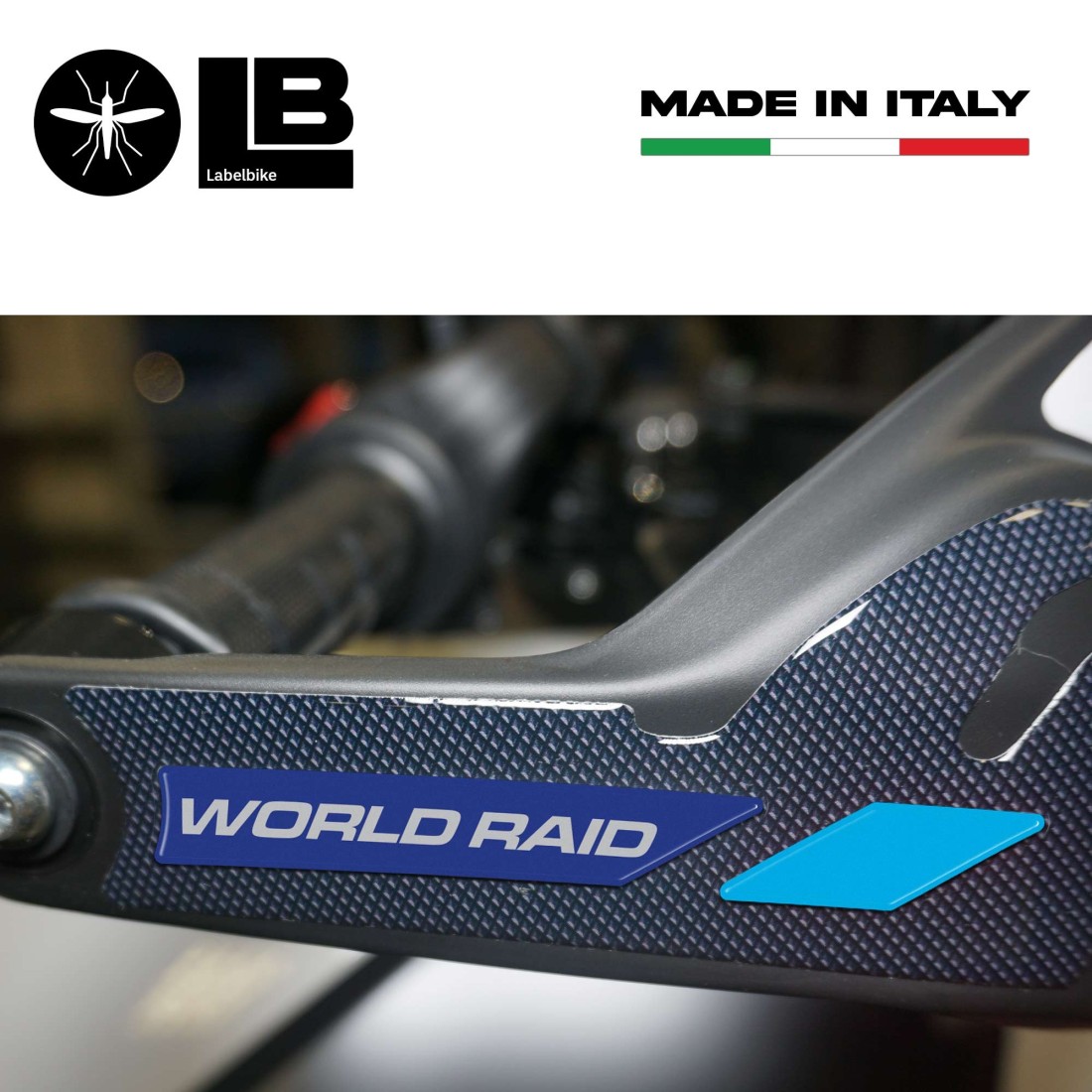 Protezioni adesive resinate per Paramani moto Yamaha Tenere 700 2022. Due adesivi per paramani moto lato destro e sinistro in resina gel 3D Esclusivi - Labelbike®. Adesivi per paramani Tenere 700 in colorazione 2022. Adesivi MADE IN ITALY realizzati in resina con effetto 3D. Grafiche con base in effetto antiscivolo e scritte World Raid.