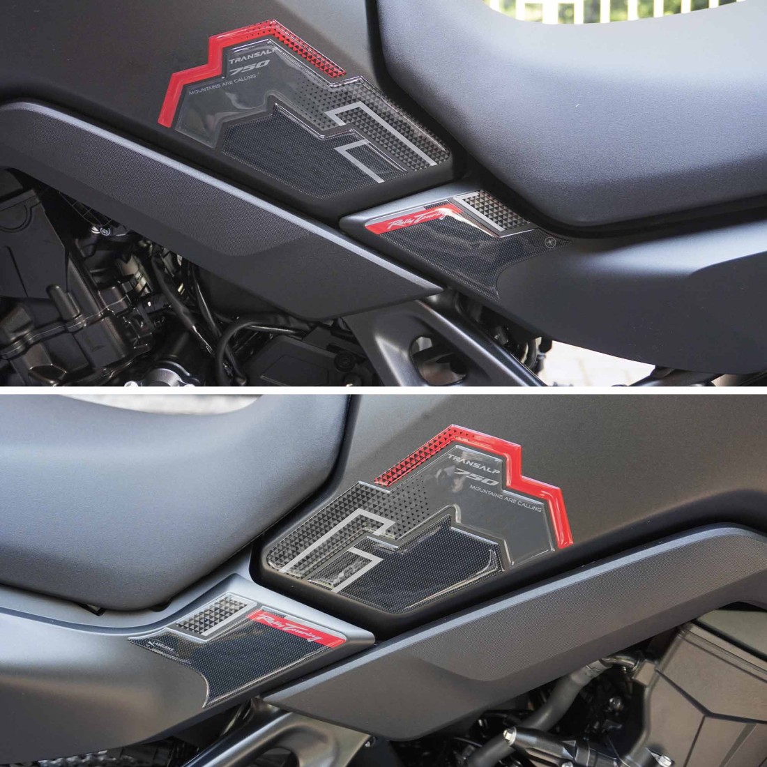 Adesivi in resina gel 3D compatibili con tutte le colorazioni (Tricolour Ross White; Matte Ballistic Black Metallic; Matte Iridium Grey Metallic) di moto XL750 Transalp dal 2023.